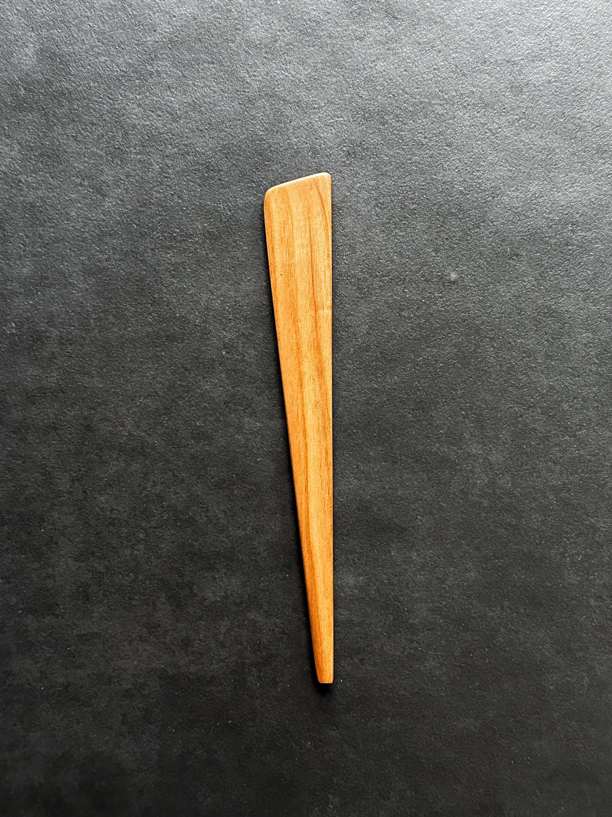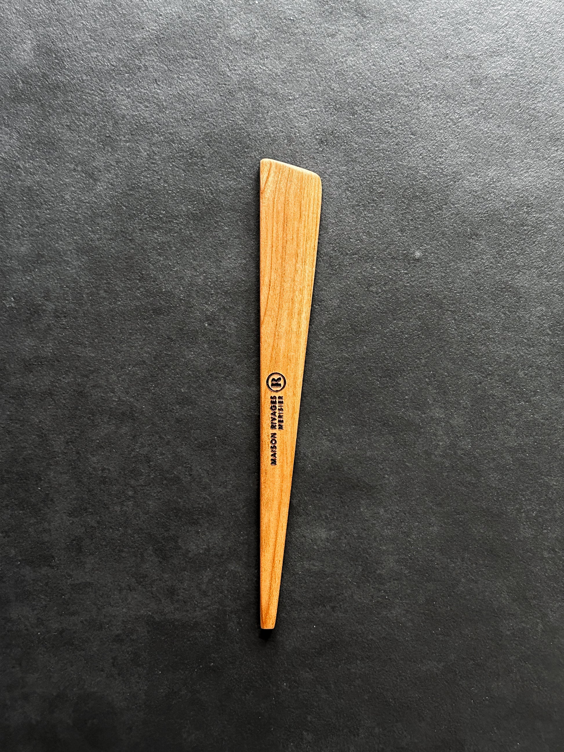 Le Couteau à Beurre, un outil essentiel pour vos gestes gourmands du quotidien. "La forme s'inspire des ailerons de surf présents sur les Bonzer Classic et des Poissons Pilotes qui sont pour moi l'image de la gourmandise chez les gens". Façonné à la main en bois par Maison RIVAGES dans son atelier à Cléder, Finistère Nord. Ciré avec soin pour protection alimentaire et durable.